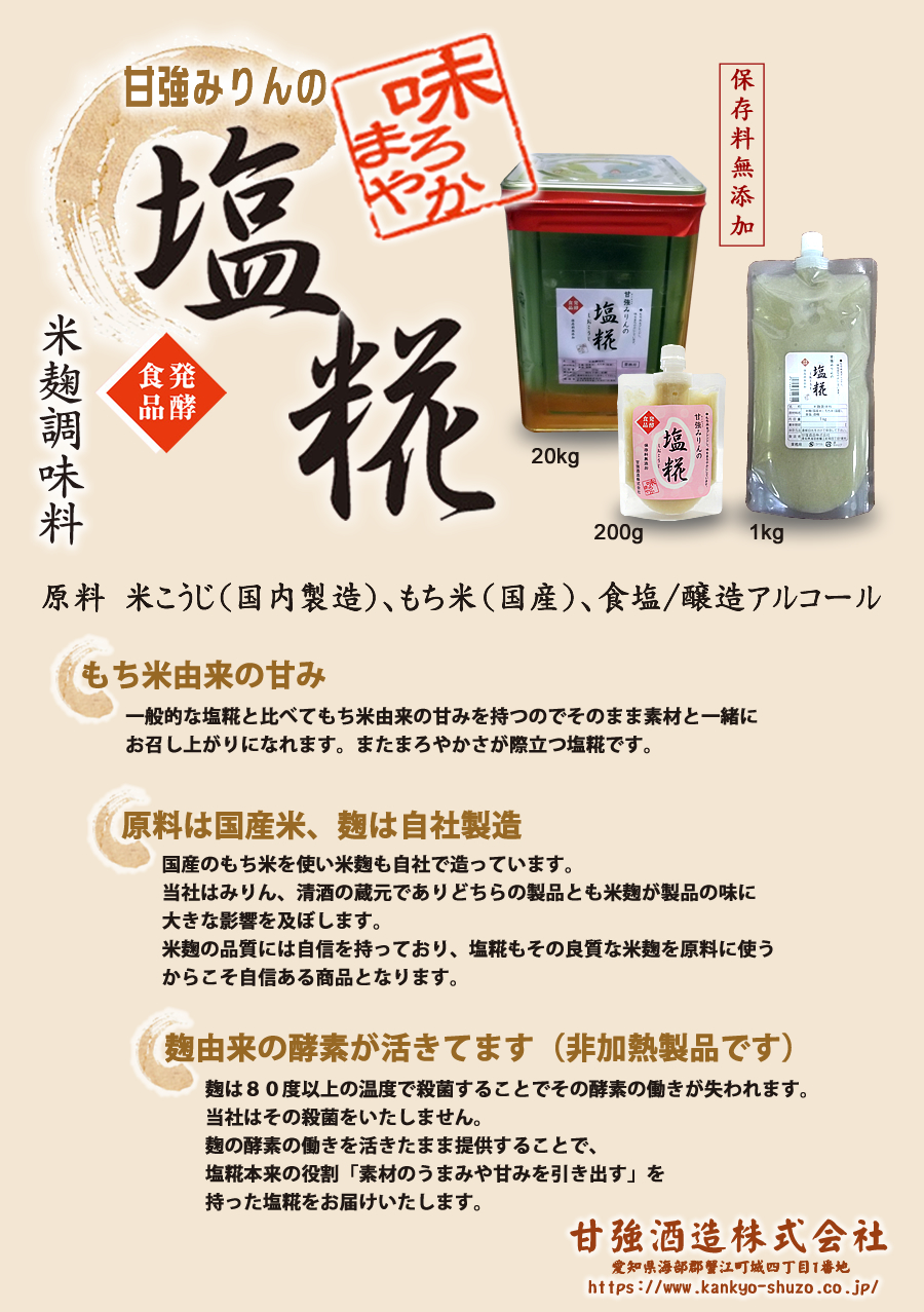 | 特徴 | 原料の米こうじは当社が本みりん製造の際に自社で製造をしているものを使用。