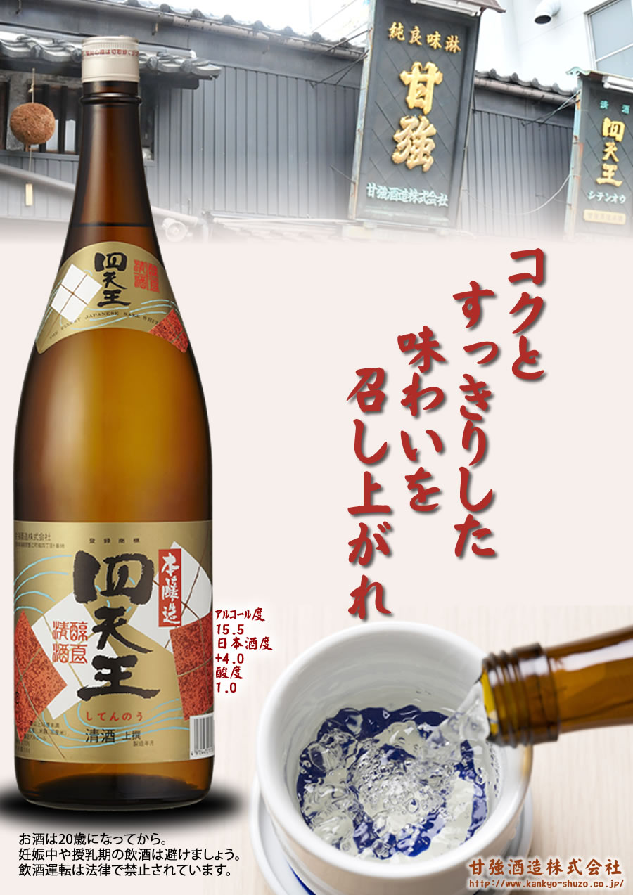 四天王 本醸造 上撰 1.8L瓶 ツイートする シェアする 販売価格: 2,018円(税込み) 会員価格 (税込み) 通常価格 (税込み) 在庫 商品コード JO18 JANコード 【注文年齢制限】20歳 ~ ご注文手続き画面にて、生年月日を入力いただきます。 ----------------------------------------------------------------品目 清酒 上撰内容量 1.8L原材料名 米(国産)、米麹(国産米)アルコール分 15.5度 精米歩合 70% 製造者甘強酒造株式会社愛知県海部郡蟹江町城四丁目1番地特徴 コクとすっきりした後味を特徴とした呑みやすいお酒です。ぬる燗または熱燗でお召し上がり下さい。ご注意 - 数量 1 2 3 4 5 6 7 8 9 10 買い物かごへ 注文年齢制限 20歳 ~ 注文手続き画面にて、生年月日を入力いただきます。
