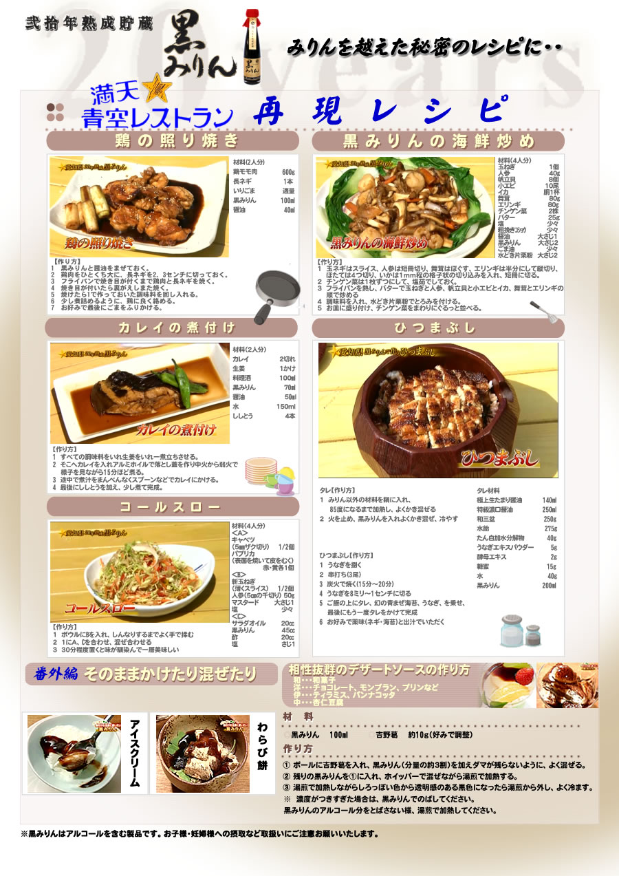 | ご注意 | 本みりんは常温で保管下さい。寒冷な場所に置きますと底に糖分の白い結晶が出来ることがあります。お湯で温めて溶かしてご使用ください。 |
