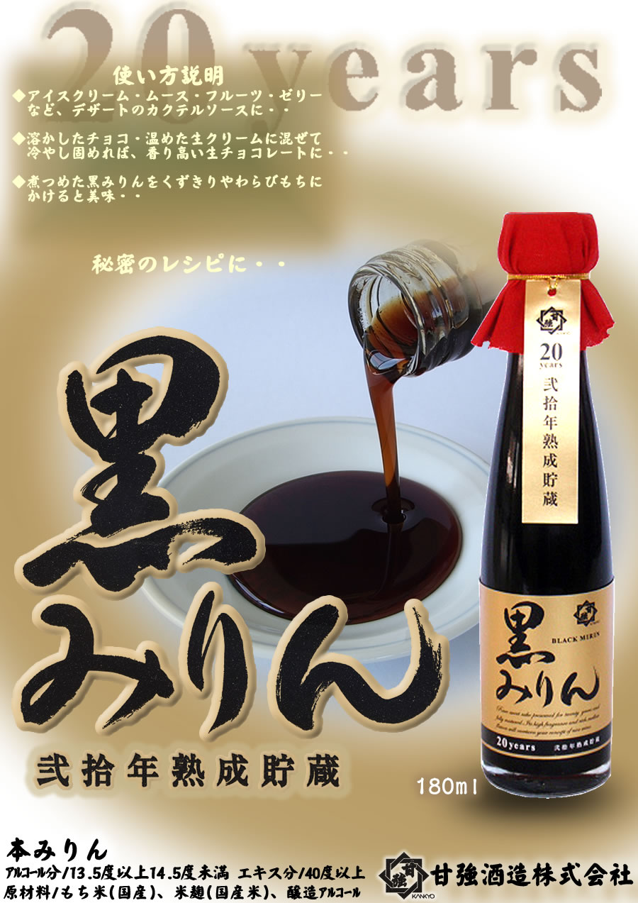 | 特徴 | 純味醂を搾ってから20年以上の歳月をかけて、蔵の中でじっくり熟成させた本味醂です。 永い歳月の間にもち米由来の糖分とアミノ酸が結合し、黒蜜や黒糖を思わせるような上品な甘味とまろやかな旨味を特徴とします。国産もち米100%使用。 |
