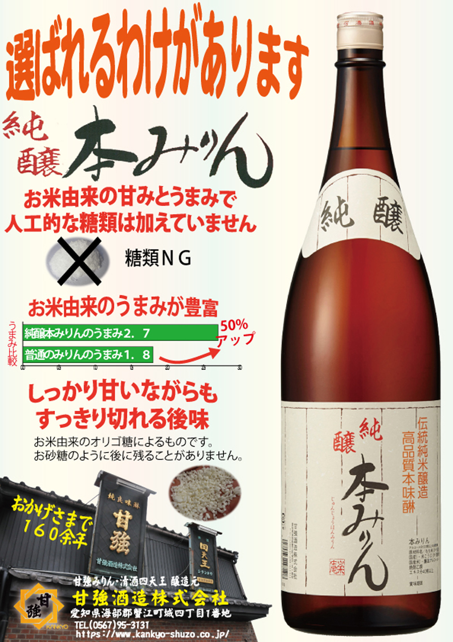 もち米の持つ旨味成分100%で糖類を使用していません。みりんの甘味、旨味は、全てもち米だけのものです。深い味わいとコクのある商品です。